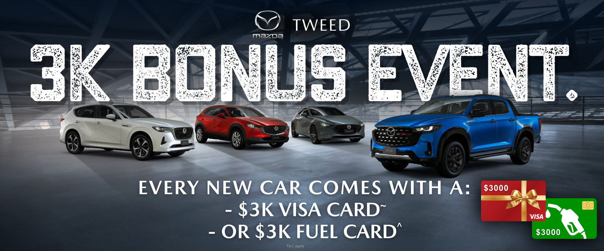 *$3,000 Bonus Offer available on selected new Mazda vehicles purchased and delivered from Tweed Mazda during the promotional period (until March 31, 2026). Eligible vehicles must be new 2025 plated stock. While stocks last. Customer must choose either a $3,000 Visa Gift Card or $3,000 Fuel Card prior to settlement. Choice cannot be changed after delivery.