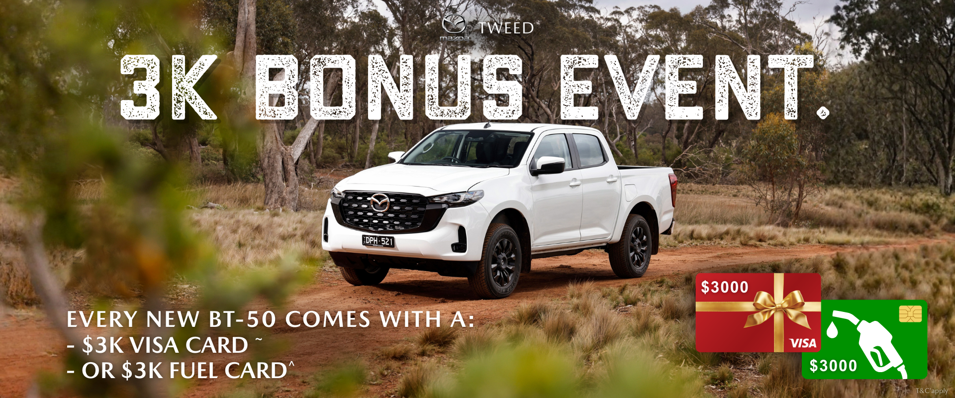 *$3,000 Bonus Offer available on selected new Mazda BT-50 vehicles purchased and delivered from Tweed Mazda during the promotional period (until March 31, 2026). Eligible vehicles must be new 2025 plated stock. While stocks last. Customer must choose either a $3,000 Visa Gift Card or $3,000 Fuel Card prior to settlement. Choice cannot be changed after delivery.